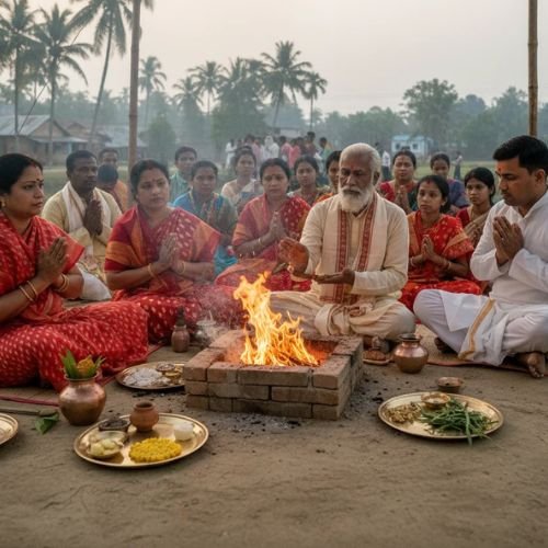 Homa Yogya is performed with Vedic mantras, offerings, and prayers to purify surroundings, remove obstacles, and invite prosperity. The ritual symbolizes devotion, spiritual awakening, and blessings for community peace and harmony.