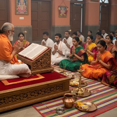 Sasthra Path involves reciting holy scriptures and chanting sacred verses with devotion. This practice spreads divine knowledge, strengthens moral values, inspires spiritual growth, and connects devotees deeply with tradition, faith, and the eternal blessings of God.